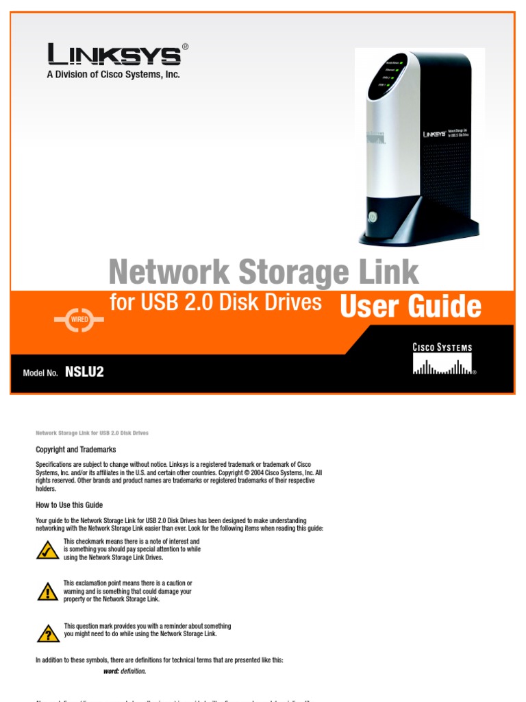 this User Guide to help you connect the Network Storage Link for USB 2.0 Disk Drives, set it up, and configure it