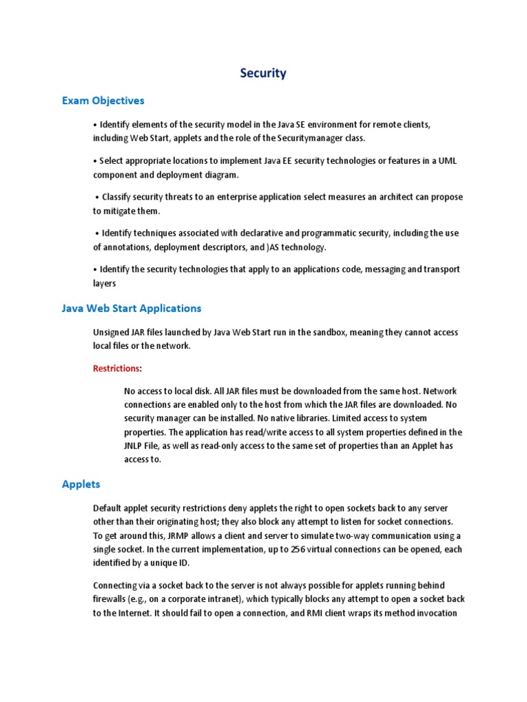 Identify elements of the security model in the Java SE environment for remote clients, including Web Start, applets and the role of the Securitymanager class. Select appropriate locations to implement Java EE security technologies or features in a UML component and deployment diagram. Classify security threats to an enterprise application select measures an architect can propose to mitigate them. Identify techniques associated with declarative and programmatic security, including the use of annotations, deployment descriptors, and )AS technology. Identify the security technologies that apply to an applications code, messaging and transport layers