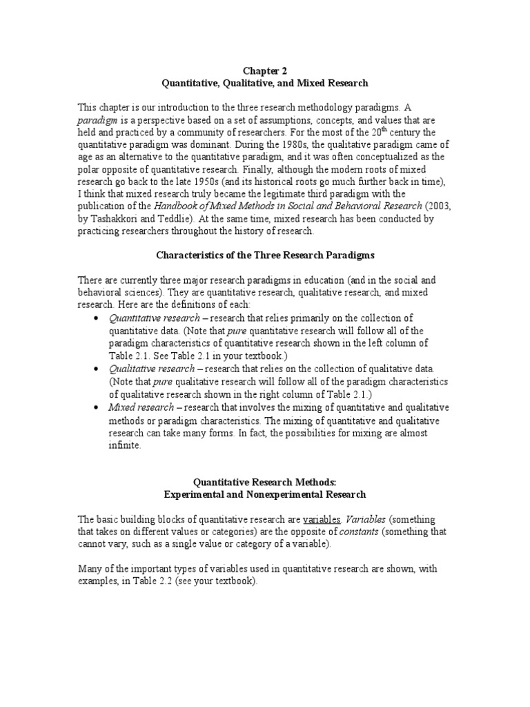 Chapter 2 Quantitative, Qualitative, and Mixed Research This chapter is our introduction to the three research methodology paradigms.