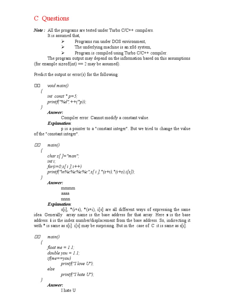 Note : All the programs are tested under Turbo C/C++ compilers. It is assumed that, Programs run under DOS en ironment, The underl!ing machine is an "#$ s!stem, Program is compiled using Turbo C/C++ compiler. The program output ma! depend on the in%ormation based on this assumptions &%or e"ample si'eo%&int( )) * ma! be assumed(. Predict the output or error&s( %or the %ollo+ing, -{ int const * p=5; printf("%d",++(*p)); } Answer: Compiler error, Cannot modi%! a constant alue. Explanation, p is a pointer to a .constant integer.. /ut +e tried to change the alue o% the .constant integer.. void main()