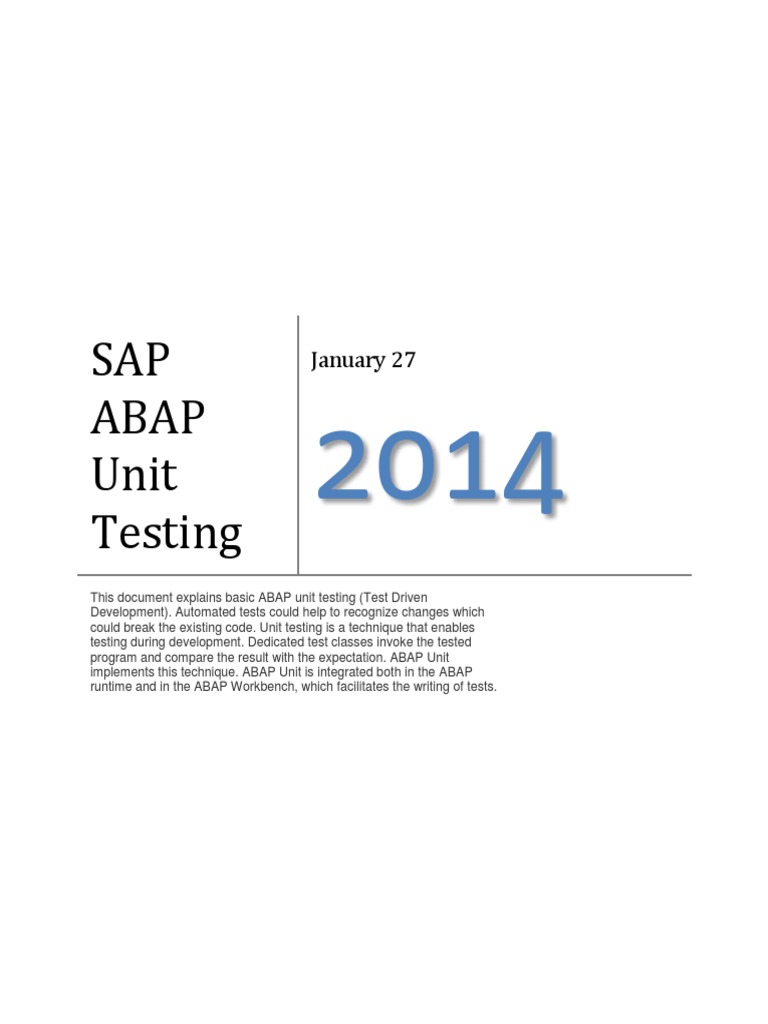 This document explains basic ABAP unit testing (Test Driven Development). Automated tests could help to recognize changes which could break the existing code. Unit testing is a technique that enables testing during development. Dedicated test classes invoke the tested program and compare the result with the expectation. ABAP Unit implements this technique. ABAP Unit is integrated both in the ABAP runtime and in the ABAP Workbench, which facilitates the writing of tests.