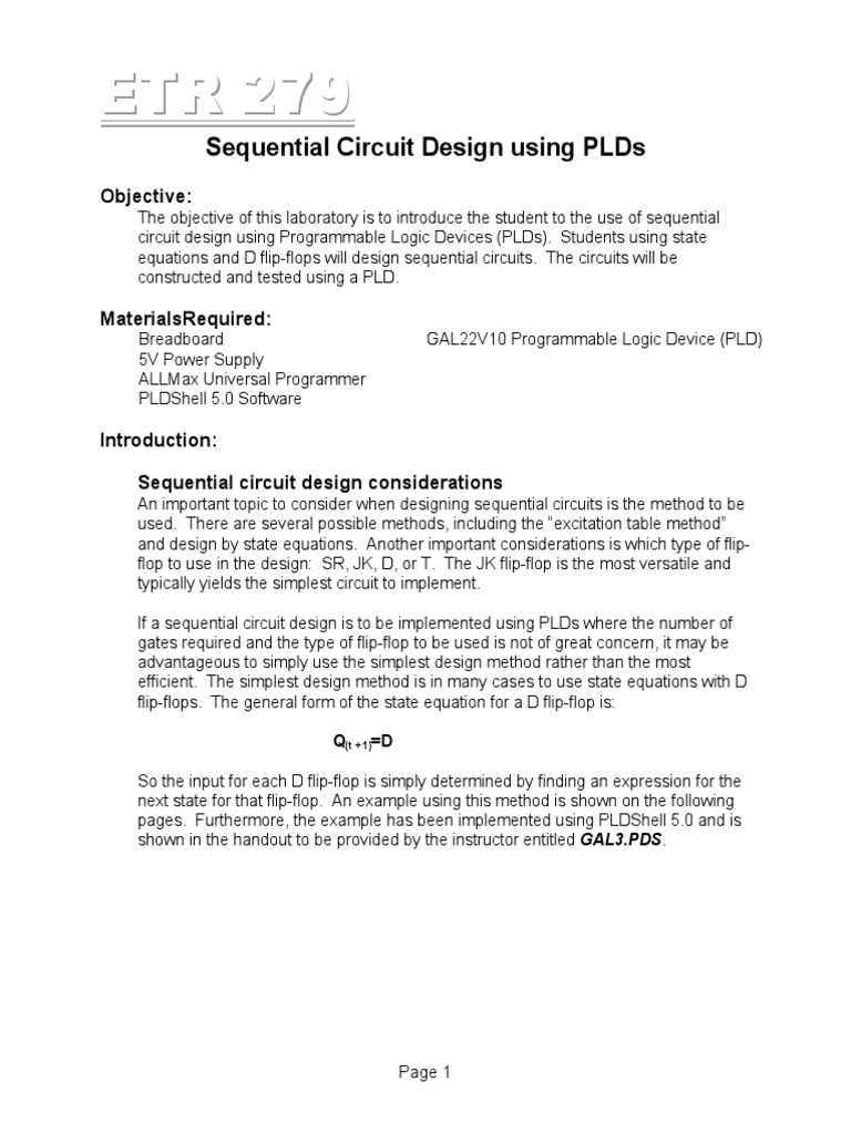 The objective of this laboratory is to introduce the student to the use of sequential circuit design using Programmable Logic Devices (PLDs). Students using state equations and D flip-flops will design sequential circuits. The circuits will be constructed and tested using a PLD.