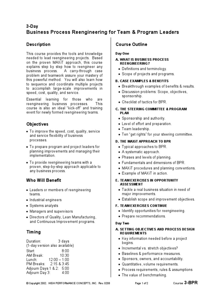 To improve the speed, cost, quality, service and service flexibility of business processes. To prepare program and project leaders for planning improvements and managing their implementation. To provide reengineering teams with a proven, step-by-step approach applicable to any business process.