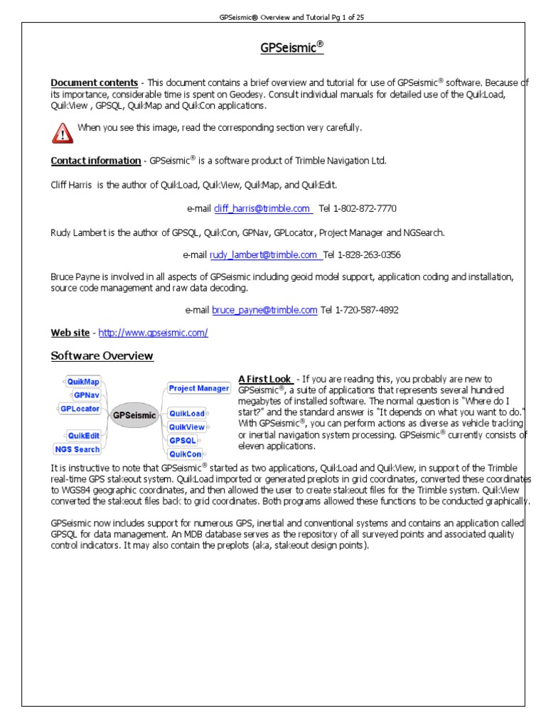 Document contents - This document contains a brief overview and tutorial for use of GPSeismic software. Because of its importance, considerable time is spent on Geodesy. Consult individual manuals for detailed use of the QuikLoad, QuikView , GPSQL, QuikMap and QuikCon applications. When you see this image, read the corresponding section very carefully. Contact information - GPSeismic is a software product of Trimble Navigation Ltd. Cliff Harris is the author of QuikLoad, QuikView, QuikMap, and QuikEdit. e-mail cliff_harris@trimble.com Tel 1-802-872-7770 Rudy Lambert is the author of GPSQL, QuikCon, GPNav, GPLocator, Project Manager and NGSearch. e-mail rudy_lambert@trimble.com Tel 1-828-263-0356 Bruce Payne is involved in all aspects of GPSeismic including geoid model support, application coding and installation, source code management and raw data decoding. e-mail bruce_payne@trimble.com Tel 1-720-587-4892 Web site - http://www.gpseismic.com/