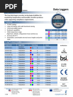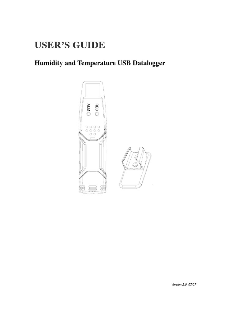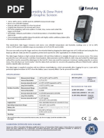 This document summarizes the features and instructions for use of a humidity and temperature datalogger. It can store up to 32,000 readings over various time intervals and has alarms for high and low humidity and temperature. LED lights indicate the logging status, alarms, and low battery. Users replace the lithium battery, start and stop logging using a button, and download data using the supplied software.