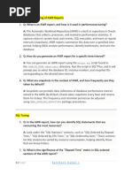 - SQL Ordered by Parse Calls: These SQLs experienced a high number of reparsing operations. - SQL Ordered by Sharable Memory: Includes SQL statements cursors which consumed a large amount of SGA shared pool memory. - SQL Ordered by Version Count: These SQLs have a large number of versions in shared pool for some reason. - Complete List of SQL Text: Instance Activity Stats This section contains statistical information describing how the database operated during the snapshot period. - Instance Activity Stats - Absolute Values: This section contains statistics that have absolute values not derived from end and start snapshots. - Instance Activity Stats - Thread Activity: This report section reports a log switch activity statistic. I/O Stats Section This section shows the all important I/O activity for the instance and shows I/O activity by tablespace, data file, and includes buffer pool statistics. - Tablespace IO Stats - File IO Stats Buffer Pool Statistics Section Advisory Statistics Section This section show details of the advisories for the buffer, shared pool, PGA and Java pool. - Instance Recovery Stats: - Buffer Pool Advisory: - PGA Aggr Summary: PGA Aggr Target Stats; PGA Aggr Target Histogram; and PGA Memory Advisory. - Shared Pool Advisory: - SGA Target Advisory - Stream Spool Advisory - Java Pool Advisory Wait St at ist ics Sect ion - Buffer Wait Statistics: This important section shows buffer cache waits statistics. - Enqueue Activity: This important section shows how enqueue operates in the database. Enqueues are special internal structures which provide concurrent access to various database resources. Undo Statistics Section - Undo Segment Summary: This section gives a summary about how undo segments are used by the database. - Undo Segment Stats: This section shows detailed history information about undo segment activity. Latch Statistics Section: This section shows details about latch statistics. Latches are a lightweight serialization mechanism that is used to single-thread access to