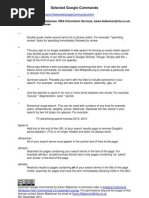 This problem set is designed to give you experiences with search operators and practice with specifying more precisely what youre seeking by using the Advanced Search form. For hints and answers to selected problems, see the Solutions page. 1. Use the s i t e :operator to search for armchairs on IKEAs site, www.ikea.com. 2. Use the Advanced Search form to find the page whose title is Some Ways to Detect Plagiarism. When the title is entered in lowercase letters, the query box on the results page contains [allintitle: ways to detect plagiarism ]. 3. Find all pages on google.com but not on answers.google.com nor on directory.google.com whose titles include the words FAQ or help. 4. Use the link: operator to see who links to googleguide.com, your companys website, or your favorite website. 5. Find pages whose titles include surfing that are not about surfing the World Wide Web. 6. Find out where the upcoming international conference on AIDS is being held. 7. How can you search for [ google help ] on Google Guide, www.googleguide.com, and on the UC Berkeley library website, www.lib.berkeley.edu? tags (keywords): advanced search, operators, queries, search operators This page was last modified on: Sunday February 26, 2012