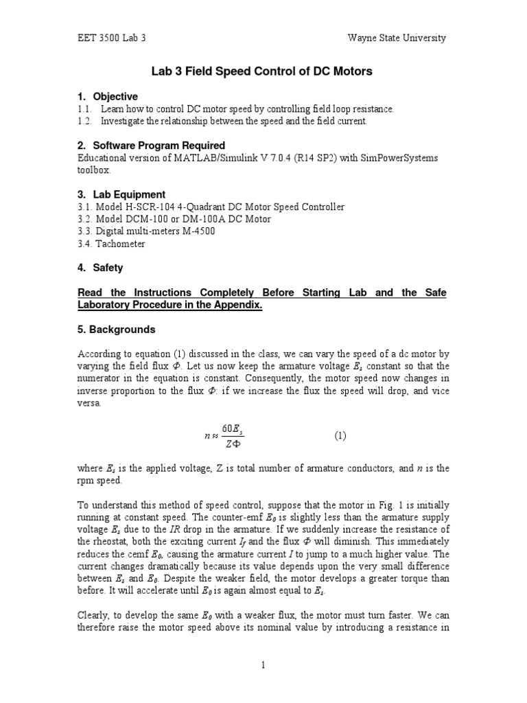 1. Objective 1.1. Learn how to control DC motor speed by controlling field loop resistance. 1.2. Investigate the relationship between the speed and the field current. 2. Software Program Required Educational version of MATLAB/Simulink V 7.0.4 (R14 SP2) with SimPowerSystems toolbox. 3. Lab Equipment 3.1. Model H-SCR-104 4-Quadrant DC Motor Speed Controller 3.2. Model DCM-100 or DM-100A DC Motor 3.3. Digital multi-meters M-4500 3.4. Tachometer 4. Safety Read the Instructions Completely Before Starting Lab and the Safe Laboratory Procedure in the Appendix. 5. Backgrounds According to equation (1) discussed in the class, we can vary the speed of a dc motor by varying the field flux . Let us now keep the armature voltage Es constant so that the numerator in the equation is constant. Consequently, the motor speed now changes in inverse proportion to the flux : if we increase the flux the speed will drop, and vice versa.
