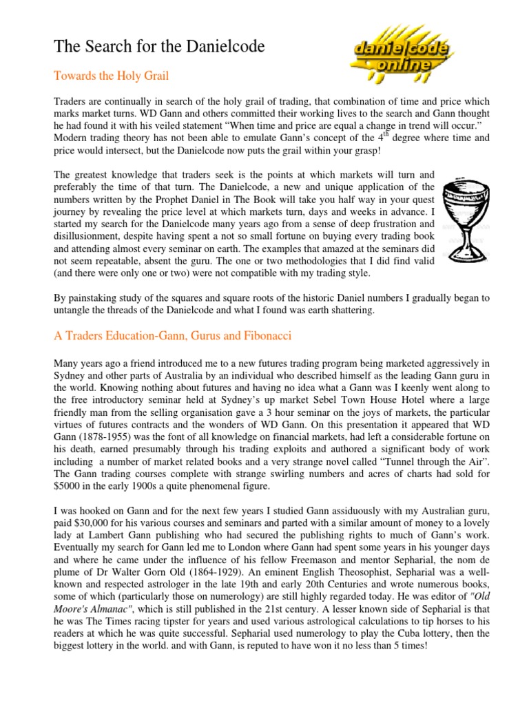 Traders are continually in search of the holy grail of trading, that combination of time and price which marks market turns. WD Gann and others committed their working lives to the search and Gann thought he had found it with his veiled statement When time and price are equal a change in trend will occur. Modern trading theory has not been able to emulate Ganns concept of the 4th degree where time and price would intersect, but the Danielcode now puts the grail within your grasp! The greatest knowledge that traders seek is the points at which markets will turn and preferably the time of that turn. The Danielcode, a new and unique application of the numbers written by the Prophet Daniel in The Book will take you half way in your quest journey by revealing the price level at which markets turn, days and weeks in advance. I started my search for the Danielcode many years ago from a sense of deep frustration and disillusionment, despite having spent a not so small fortune on buying every trading book and attending almost every seminar on earth. The examples that amazed at the seminars did not seem repeatable, absent the guru. The one or two methodologies that I did find valid (and there were only one or two) were not compatible with my trading style. By painstaking study of the squares and square roots of the historic Daniel numbers I gradually began to untangle the threads of the Danielcode and what I found was earth shattering.