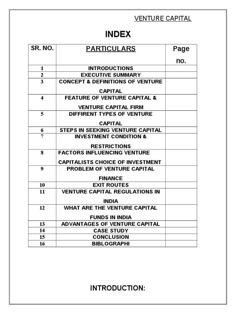 INTRODUCTIONS EXECUTIVE SUMMARY CONCEPT & DEFINITIONS OF VENTURE CAPITAL FEATURE OF VENTURE CAPITAL & VENTURE CAPITAL FIRM DIFFIRENT TYPES OF VENTURE CAPITAL STEPS IN SEEKING VENTURE CAPITAL INVESTMENT CONDITION & RESTRICTIONS FACTORS INFLUENCING VENTURE CAPITALISTS CHOICE OF INVESTMENT PROBLEM OF VENTURE CAPITAL FINANCE EXIT ROUTES VENTURE CAPITAL REGULATIONS IN INDIA WHAT ARE THE VENTURE CAPITAL FUNDS IN INDIA ADVANTAGES OF VENTURE CAPITAL CASE STUDY CONCLUSION BIBLOGRAPHI