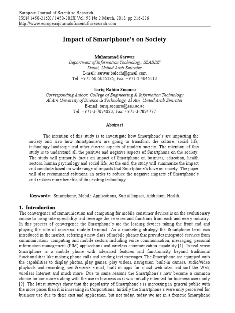 Muhammad Sarwar Department of Information Technology, SZABIST Dubai, United Arab Emirates E-mail: sarwar.baloch@gmail.com Tel: +971-50-5055285; Fax: +971-2-4045110 Tariq Rahim Soomro Corresponding Author, College of Engineering & Information Technology Al Ain University of Science & Technology, Al Ain, United Arab Emirates E-mail: tariq.soomro@aau.ac.ae Tel: +971-3-7024883; Fax: +971-3-7024777 Abstract The intention of this study is to investigate how Smartphones are impacting the society and also how Smartphones are going to transform the culture, social life, technology landscape and other diverse aspects of modern society. The intention of this study is to understand all the positive and negative aspects of Smartphone on the society. The study will primarily focus on impact of Smartphone on business, education, health sectors, human psychology and social life. At the end, the study will summarize the impact and conclude based on wide range of impacts that Smartphones have on society. The paper will also recommend solutions, in order to reduce the negative impacts of Smartphones and realizes more benefits of this exiting technology. Keywords: Smartphone, Mobile Applications, Social Impact, Addiction, Health.