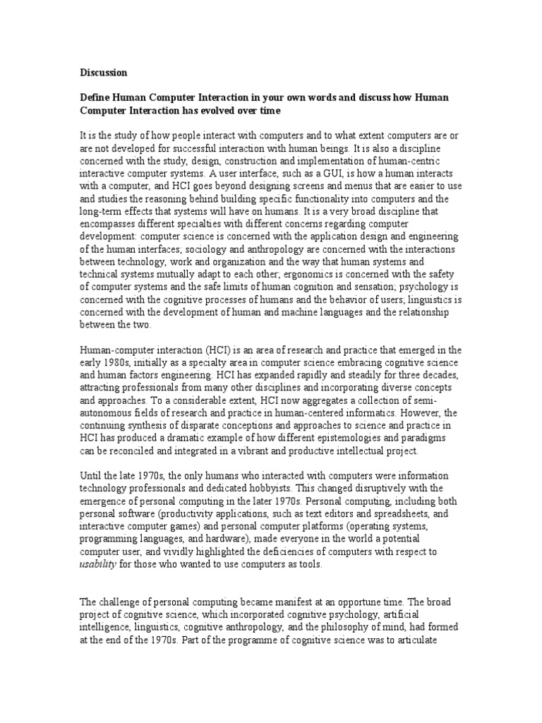 Discussion Define Human Computer Interaction in your own words and discuss how Human Computer Interaction has