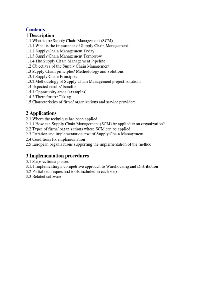 1.1 What is the Supply Chain Management (SCM) 1.1.1 What is the importance of Supply Chain Management 1.1.2 Supply Chain Management Today 1.1.3 Supply Chain Management Tomorrow 1.1.4 The Supply Chain Management Pipeline 1.2 Objectives of the Supply Chain Management 1.3 Supply Chain principles/ Methodology and Solutions 1.3.1 Supply Chain Principles 1.3.2 Methodology of Supply Chain Management project-solutions 1.4 Expected results/ benefits 1.4.1 Opportunity areas (examples) 1.4.2 There for the Taking 1.5 Characteristics of firms/ organizations and service providers