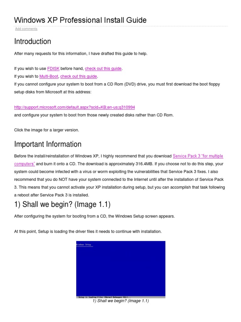 If you wish to use FDISK before hand, check out this guide. If you wish to Multi-Boot, check out this guide. If you cannot configure your system to boot from a CD Rom (DVD) drive, you must first download the boot floppy setup disks from Microsoft at this address: