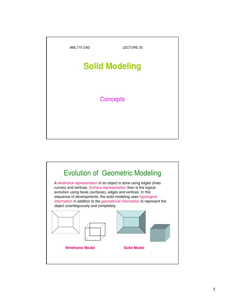 Unlike wireframes and surface representations which contain only geometrical data, the solid model uses topological information in addition to the geometrical information to represent the object unambiguously and completely. Solid model results in accurate design, helps to further the goal of CAD/ CAM like CIM, Flexible manufacturing leading to better automation of the manufacturing process. Geometry: The graphical information of dimension, length, angle, area and transformations Topology: The invisible information about the connectivity, neighborhood, associatively etc Is a solid model just a shaded image? Three dimensional addressability? Suitable for automation? Wireframe Model Solid Model