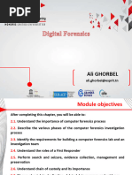 The goal is to collect and analyze the digital evidence that was obtained from the physical investigation phase and through any other future means. It includes similar phases as the Physical Investigation phases, although the primary focus is on the digital evidence. The six phases are:1. 2. 3. 4. Preservation phase; which preserves the digital crime scene so that evidence can later be synchronized and analyzed for further evidence. Survey phase; whereby the investigator transfers the relevant data from a venue out of physical or administrative control of the investigator to a controlled location. Documentation phase; which involves properly documenting the digital evidence when it is found. This information is helpful in the presentation phase. Search and collection phase; whereby an in-depth analysis of the digital evidence is performed. Software tools are used to reveal hidden, deleted, swapped and corrupted files that were used including the dates, duration, log file etc. Low-level time lining is performed to trace a users activities and identity.