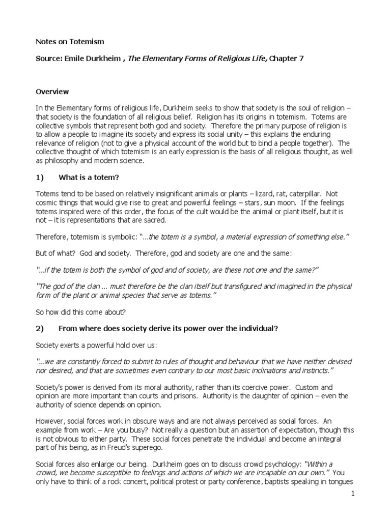 Overview In the Elementary forms of religious life, Durkheim seeks to show that society is the soul of religion that society is the foundation of all religious belief. Religion has its origins in totemism. Totems are collective symbols that represent both god and society. Therefore the primary purpose of religion is to allow a people to imagine its society and express its social unity this explains the enduring relevance of religion (not to give a physical account of the world but to bind a people together). The collective thought of which totemism is an early expression is the basis of all religious thought, as well as philosophy and modern science. 1) What is a totem?