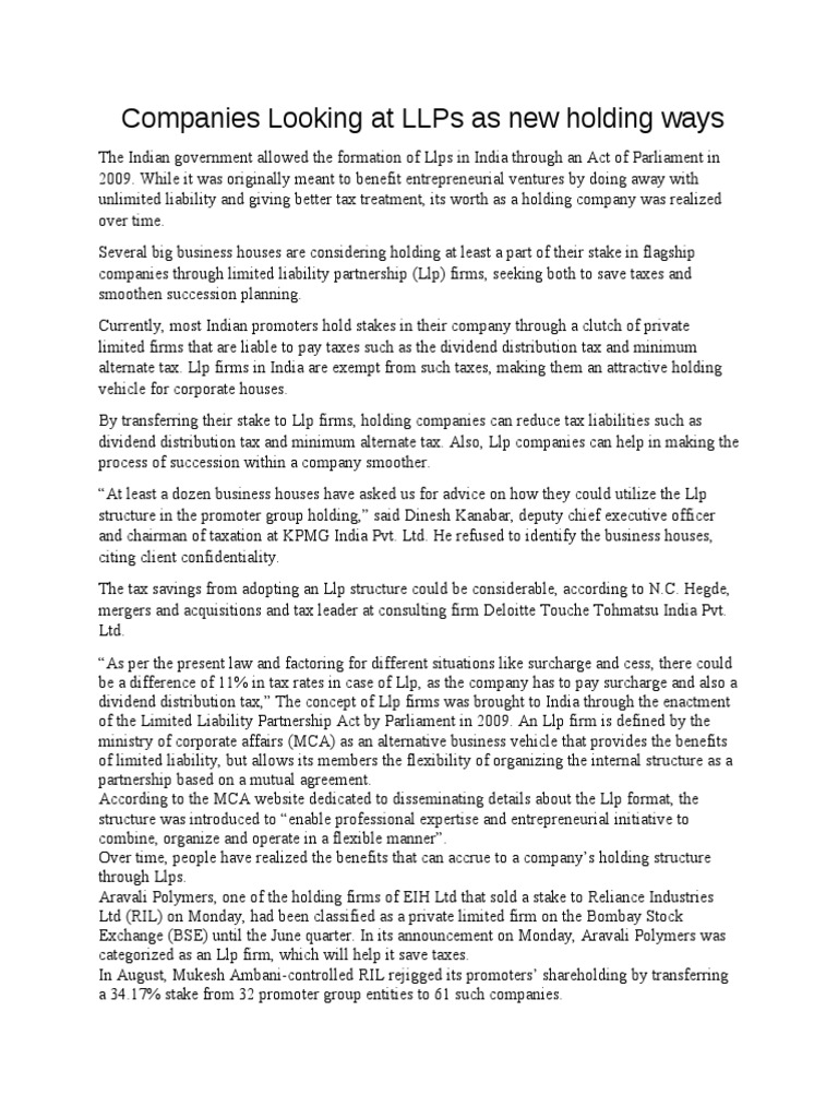 Companies Looking at LLPs as new holding ways