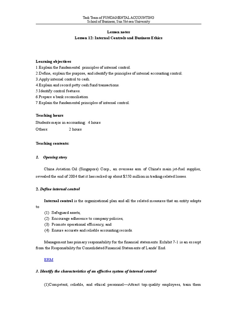 Teaching contents: 1. Opening story China A"ia ion Oil 5Sin+a(o#e6 Co#(&, an o"e#seas a#m of China7s main 3e !fuel su((lie#, #e"eale) he en) of *88- ha i has #acke) u( a1ou 9..8 million in #a)in+!#ela e) losses& 2. Define internal control Internal control is he o#+ani:a ional (lan an) all he #ela e) measu#es ha an en i $ a)o( s o 5%6 5*6 5,6 5-6 Safe+ua#) asse s, Encou#a+e a)he#ence o com(an$ (olicies, 0#omo e o(e#a ional efficienc$, an) Ensu#e accu#a e an) #elia1le accoun in+ #eco#)s&