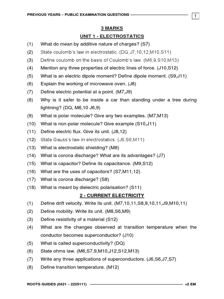 (10) What is non-polar molecule? Give example (S10,J11) (11) Define electric flux. Give its unit. (J8,12) (12) State Gausss law in electrostatics. (J6,S6,M11) (13) What is electrostatic shielding? (M8) (14) What is corona discharge? What are its advantages? (J7) (15) What is capacitor? Define its capacitance. (M9,S12) (16) What are the uses of capacitors? (S7,M11,12) (17) What is corona discharge? (S8) (18) What is meant by dielectric polarisation? (S11) 2 - CURRENT ELECTRICITY (1) (2) (3) (4) Define drift velocity. Write its unit. (M7,10,11,S8,9,10,11,J9,M10,11) Define mobility. Write its unit. (M8,S6,M9) Define resistivity of a material (S12) What are the changes observed at transition temperature when the conductor becomes superconductor? (J10) (5) (6) (7) (8) What is called superconductivity? (DQ) State ohms law. (M6,S7,9,M10,J12,S12,M13) Write any three applications of superconductors. (J6,S6,J7,S7) Define transition temperature. (M12)