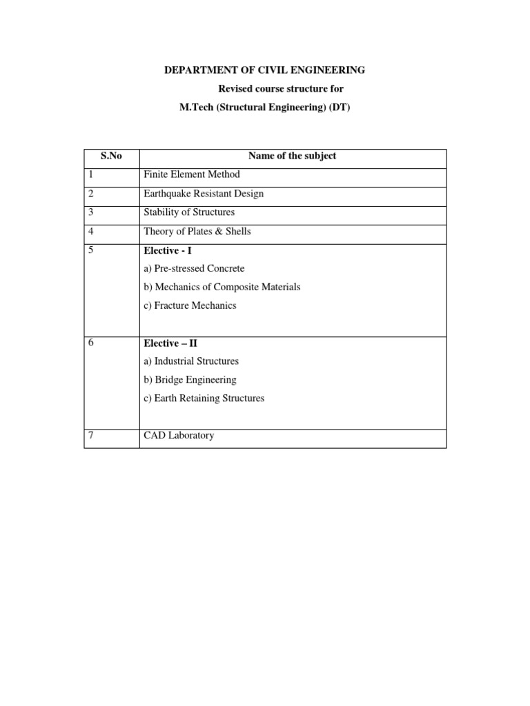 Earthquake Resistant Design Stability of Structures Theory of Plates & Shells Elective - I a) Pre-stressed Concrete b) Mechanics of Composite Materials c) Fracture Mechanics Elective II a) Industrial Structures b) Bridge Engineering c) Earth Retaining Structures