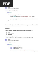 // do some string tests Console.WriteLine("Calling string.Trim: {0}", myString.Trim()); Console.WriteLine("Calling string.ToUpper: {0}", myString.ToUpper()) ; Console.WriteLine("Calling string.ToLower: {0}", myString.ToLower()) ; Console.WriteLine("Calling string.IndexOf: {0}", myString.IndexOf("a ")); Console.WriteLine("Calling string.LastIndexOf: {0}", myString.LastIn dexOf("and")); Variable Scope for (int i = 0; i < 10; i++) { int var1 = 20; Console.WriteLine("The value of var1 at pass {0} is {1} ", i, va r1); } //Console.WriteLine("{0}", var1); Type Conversion int i = 10; short x = 5; float f = 20.0f; i = x; x = i; f = i; i = f; -----------------------------------------------Chapter 5: -----------------------------------------------Defining a Class MyClass myC = new MyClass(); Console.WriteLine("Calling myFunction: {0}", myC.myFunction()); Console.WriteLine("Using a static member: {0}", MyClass.myStaticInt) ; class MyClass