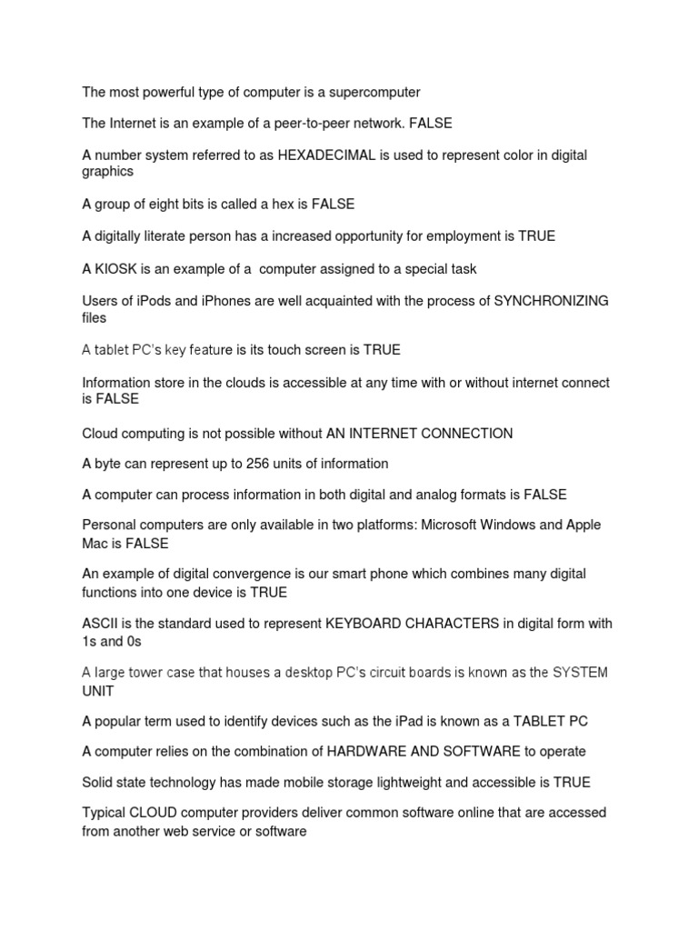 FALSE A number system referred to as HEXADECIMAL is used to represent color in digital graphics A group of eight bits is called a hex is FALSE A digitally literate person has a increased opportunity for employment is TRUE A KIOSK is an example of a computer assigned to a special task Users of iPods and iPhones are well acquainted with the process of SYNCHRONIZING files A tablet PCs key feature is its touch screen is TRUE Information store in the clouds is accessible at any time with or without internet connect is FALSE Cloud computing is not possible without AN INTERNET CONNECTION A byte can represent up to 256 units of information A computer can process information in both digital and analog formats is FALSE Personal computers are only available in two platforms: Microsoft Windows and Apple Mac is FALSE An example of digital convergence is our smart phone which combines many digital functions into one device is TRUE ASCII is the standard used to represent KEYBOARD CHARACTERS in digital form with 1s and 0s A large tower case that houses a desktop PCs circuit boards is known as the SYSTEM UNIT A popular term used to identify devices such as the iPad is known as a TABLET PC A computer relies on the combination of HARDWARE AND SOFTWARE to operate Solid state technology has made mobile storage lightweight and accessible is TRUE Typical CLOUD computer providers deliver common software online that are accessed from another web service or software