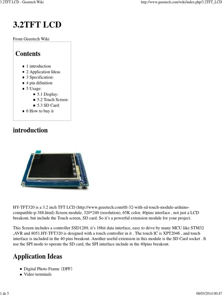 1 introduction 2 Application Ideas 3 Specification: 4 pin difinition 5 Usage: 5.1 Display: 5.2 Touch Screen: 5.3 SD Card: 6 How to buy it