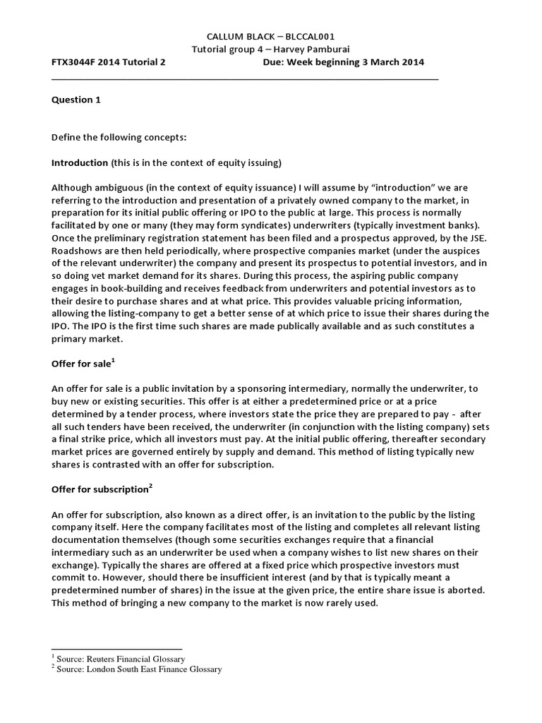 Define the following concepts: Introduction (this is in the context of equity issuing) Although ambiguous (in the context of equity issuance) I will assume by introduction we are referring to the introduction and presentation of a privately owned company to the market, in preparation for its initial public offering or IPO to the public at large. This process is normally facilitated by one or many (they may form syndicates) underwriters (typically investment banks). Once the preliminary registration statement has been filed and a prospectus approved, by the JSE. Roadshows are then held periodically, where prospective companies market (under the auspices of the relevant underwriter) the company and present its prospectus to potential investors, and in so doing vet market demand for its shares. During this process, the aspiring public company engages in book-building and receives feedback from underwriters and potential investors as to their desire to purchase shares and at what price. This provides valuable pricing information, allowing the listing-company to get a better sense of at which price to issue their shares during the IPO. The IPO is the first time such shares are made publically available and as such constitutes a primary market. Offer for sale1 An offer for sale is a public invitation by a sponsoring intermediary, normally the underwriter, to buy new or existing securities. This offer is at either a predetermined price or at a price determined by a tender process, where investors state the price they are prepared to pay - after all such tenders have been received, the underwriter (in conjunction with the listing company) sets a final strike price, which all investors must pay. At the initial public offering, thereafter secondary market prices are governed entirely by supply and demand. This method of listing typically new shares is contrasted with an offer for subscription. Offer for subscription2 An offer for subscription, also known as a direct offer, is an invitation to the public by the listing company itself. Here the company facilitates most of the listing and completes all relevant listing documentation themselves (though some securities exchanges require that a financial intermediary such as an underwriter be used when a company wishes to list new shares on their exchange). Typically the shares are offered at a fixed price which prospective investors must commit to. However, should there be insufficient interest (and by that is typically meant a predetermined number of shares) in the issue at the given price, the entire share issue is aborted. This method of bringing a new company to the market is now rarely used.