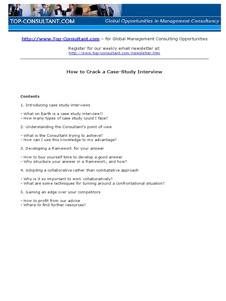 Contents 1. Introducing case study interviews - What on Earth is a case study interview?! - How many types of case study could I face? 2. Understanding the Consultant's point of view - What is the Consultant trying to achieve? - How can I use this knowledge to my advantage? 3. Developing a framework for your answer - How to buy yourself time to develop a good answer - Why structure your answer in a framework, and how? 4. Adopting a collaborative rather than combatative approach - Why is it so important to work collaboratively? - What are some techniques for turning around a confrontational situation? 5. Gaining an edge over your competitors - How to profit from our advice - Where to find further resources?