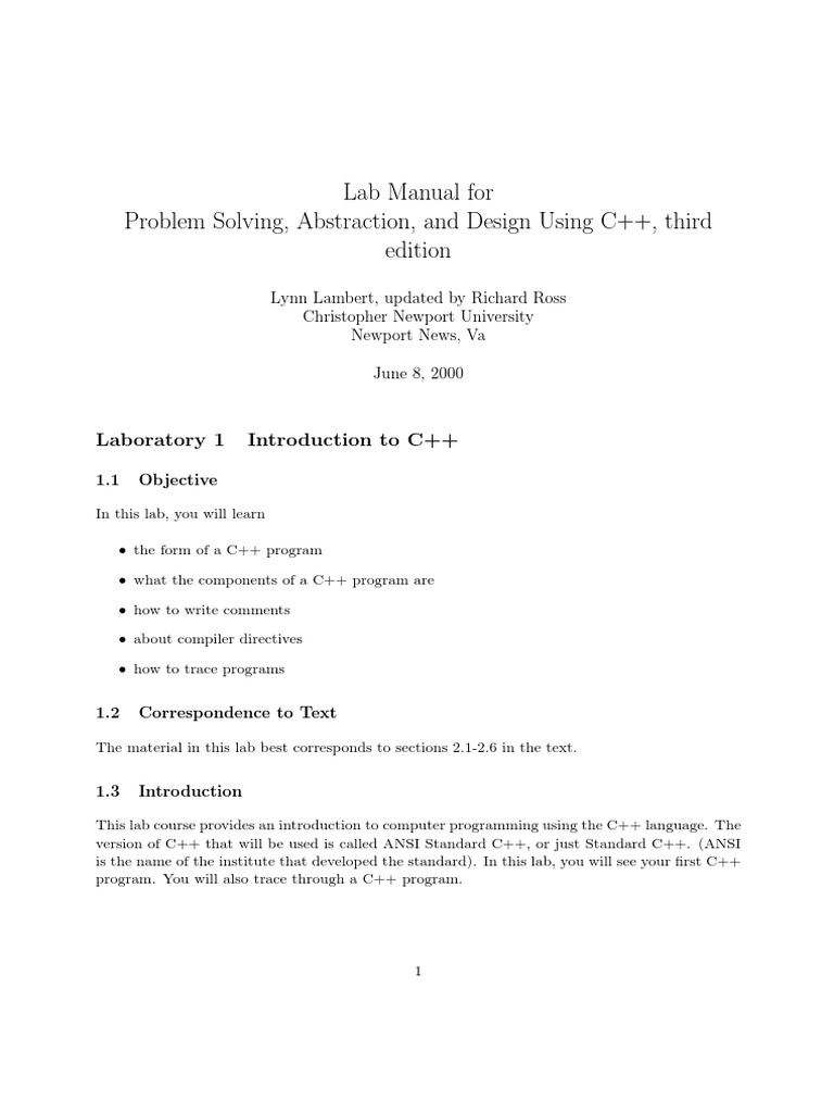 This lab course provides an introduction to computer programming using the C++ language. The version of C++ that will be used is called ANSI Standard C++, or just Standard C++. (ANSI is the name of the institute that developed the standard). In this lab, you will see your rst C++ program. You will also trace through a C++ program.