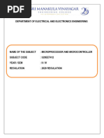 LTPC 3003 UNIT I 8085 and 8086 PROCESSOR 9 Hardware Architecture pintouts - Signals Memory interfacing I/O ports and data transfer concepts Timing Diagram Interrupt structure. UNIT II PROGRAMMING OF 8085 PROCESSOR 9 Instruction format and addressing modes Assembly language format Data transfer, data manipulation & control instructions Programming: Loop structure with counting & Indexing Look up table - Subroutine instructions - stack. UNIT III PERIPHERAL INTERFACING 9 Study of Architecture and programming of ICs: 8255 PPI, 8259 PIC, 8251 USART, 8279 Key boarddisplay controller and 8253 Timer/ Counter Interfacing with 8085 - A/D and D/A converter interfacing. UNIT IV 8051 MICRO CONTROLLER 9 Functional block diagram - Instruction format and addressing modes Timing Diagram Interrupt structure Timer I/O ports Serial communication. UNIT V MICRO CONTROLLER PROGRAMMING & APPLICATIONS 9 Data Transfer, Manipulation, Control & I/O instructions Simple programming exercises key board and display interface Closed loop control of servo motor- stepper motor control Washing Machine Control. L = 45 T = 15 TOTAL : 60 PERIODS TEXT BOOKS 1. Microprocessor and Microcontrollers, Krishna Kant Eastern Company Edition, Prentice Hall of India, New Delhi , 2007. 2. Muhammad Ali Mazidi & Janice Gilli Mazidi, R.D.Kinely The 8051 Micro Controller and Embedded Systems, PHI Pearson Education, 5th Indian reprint, 2003. REFERENCES 1. R.S. Gaonkar, Microprocessor Architecture Programming and Application, Wiley Eastern Ltd., New Delhi. 2. The 8088 & 8086 Microprocessors , Walter A Tribal & Avtar Singh, Pearson, 2007, Fourth Edition.
