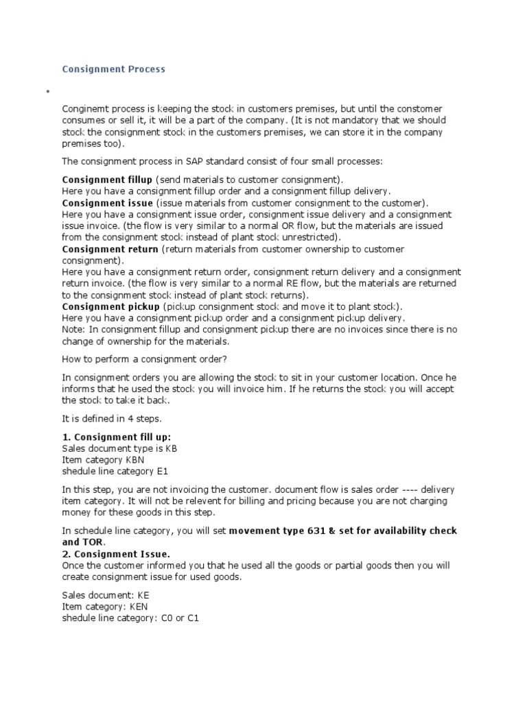 l it, it will be a part of the company. (It is not mandatory that we should stock the consignment stock in the customers premises, we can store it in the company premises too). The consignment process in SAP standard consist of four small processes: Consignment fillup (send materials to customer consignment). Here you have a consignment fillup order and a consignment fillup delivery. Consignment issue (issue materials from customer consignment to the customer). Here you have a consignment issue order, consignment issue delivery and a consignment issue invoice. (the flow is very similar to a normal OR flow, but the materials are issued from the consignment stock instead of plant stock unrestricted). Consignment return (return materials from customer ownership to customer consignment). Here you have a consignment return order, consignment return delivery and a consignment return invoice. (the flow is very similar to a normal RE flow, but the materials are returned to the consignment stock instead of plant stock returns). Consignment pickup (pickup consignment stock and move it to plant stock). Here you have a consignment pickup order and a consignment pickup delivery. Note: In consignment fillup and consignment pickup there are no invoices since there is no change of ownership for the materials. How to perform a consignment order? In consignment orders you are allowing the stock to sit in your customer location. Once he informs that he used the stock you will invoice him. If he returns the stock you will accept the stock to take it back. It is defined in 4 steps. 1. Consignment fill up: Sales document type is KB Item category KBN shedule line category E1 In this step, you are not invoicing the customer. document flow is sales order ---- delivery item category. It will not be relevent for billing and pricing because you are not charging money for these goods in this step. In schedule line category, you will set movement type 631 & set for availability check and TOR. 2. Consignment Issue. Once the customer informed you that he used all the goods or partial goods then you will create consignment issue for used goods. Sales document: KE Item category: KEN shedule line category: C0 or C1