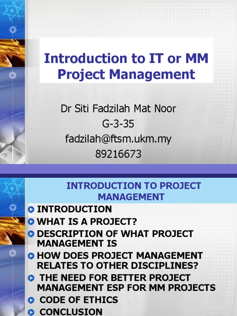 INTRODUCTION TO PROJECT MANAGEMENT INTRODUCTION WHAT IS A PROJECT? DESCRIPTION OF WHAT PROJECT MANAGEMENT IS HOW DOES PROJECT MANAGEMENT RELATES TO OTHER DISCIPLINES? THE NEED FOR BETTER PROJECT MANAGEMENT ESP FOR MM PROJECTS CODE OF ETHICS CONCLUSION