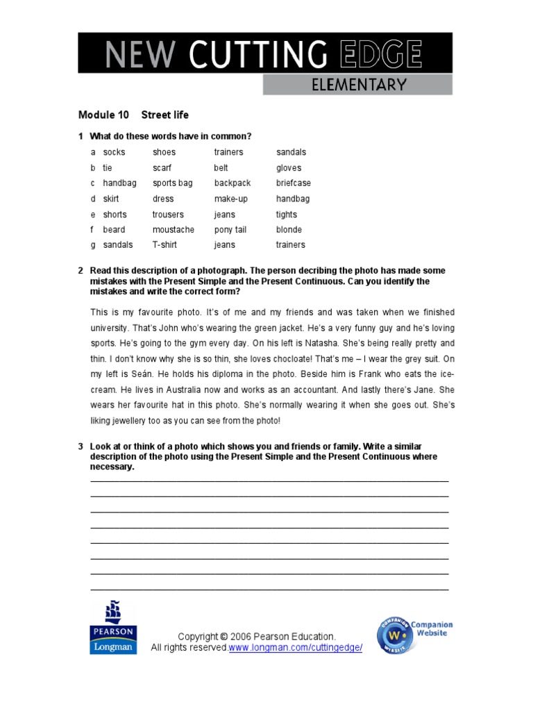 2 Read this description of a photograph. The person decribing the photo has made some mistakes with the Present Simple and the Present Continuous. Can you identify the mistakes and write the correct form? This is my favourite photo. Its of me and my friends and was taken when we finished university. Thats John whos wearing the green jacket. Hes a very funny guy and hes loving sports. Hes going to the gym every day. On his left is Natasha. Shes being really pretty and thin. I dont know why she is so thin, she loves chocloate! Thats me I wear the grey suit. On my left is Sen. He holds his diploma in the photo. Beside him is Frank who eats the icecream. He lives in Australia now and works as an accountant. And lastly theres Jane. She wears her favourite hat in this photo. Shes normally wearing it when she goes out. Shes liking jewellery too as you can see from the photo! 3 Look at or think of a photo which shows you and friends or family. Write a similar description of the photo using the Present Simple and the Present Continuous where necessary. ___________________________________________________________________________ ___________________________________________________________________________ ___________________________________________________________________________ ___________________________________________________________________________ ___________________________________________________________________________ ___________________________________________________________________________ ___________________________________________________________________________ ___________________________________________________________________________
