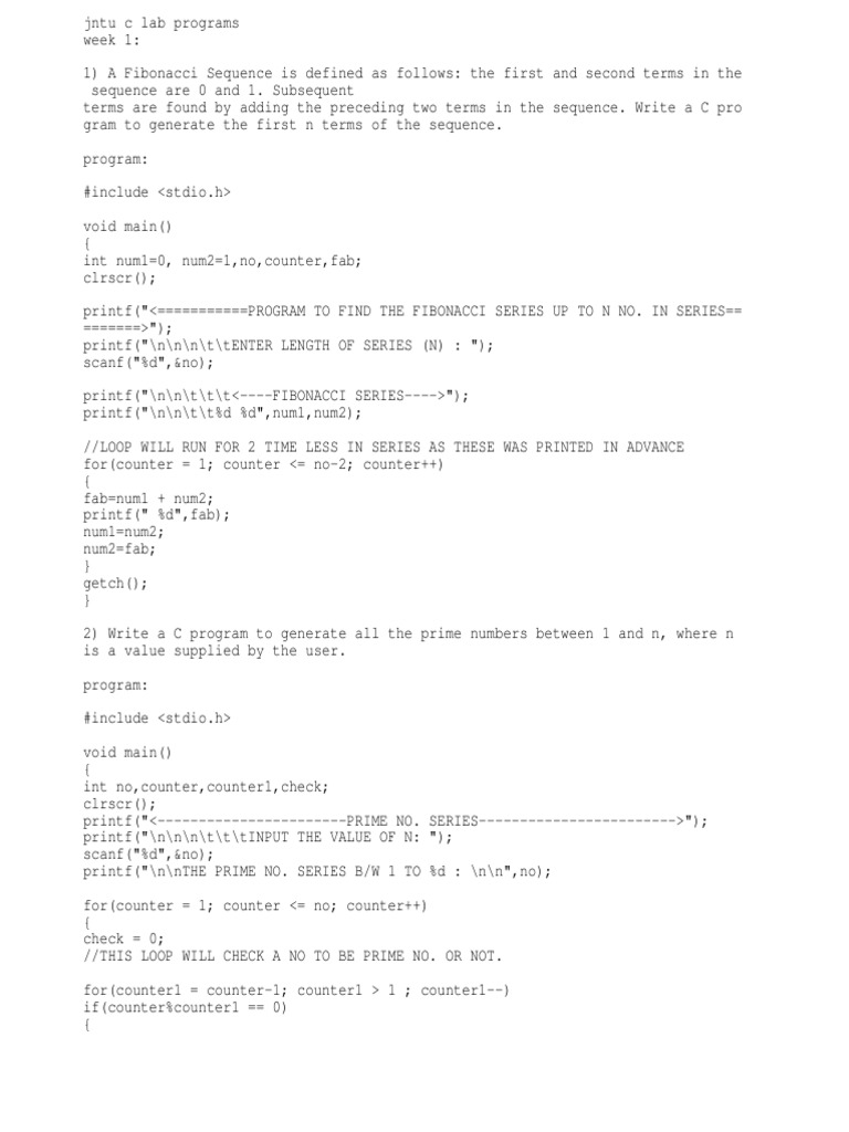 are 0 and 1. Subsequent terms are found by adding the preceding two terms in the sequence. Write a C pro gram to generate the first n terms of the sequence. program: #include <stdio.h> void main() { int num1=0, num2=1,no,counter,fab; clrscr(); printf("<===========PROGRAM TO FIND THE FIBONACCI SERIES UP TO N NO. IN SERIES== =======>"); printf("\n\n\n\t\tENTER LENGTH OF SERIES (N) : "); scanf("%d",&no); printf("\n\n\t\t\t<----FIBONACCI SERIES---->"); printf("\n\n\t\t%d %d",num1,num2); //LOOP WILL RUN FOR 2 TIME LESS IN SERIES AS THESE WAS PRINTED IN ADVANCE for(counter = 1; counter <= no-2; counter++) { fab=num1 + num2; printf(" %d",fab); num1=num2; num2=fab; } getch(); } 2) Write a C program to generate all the prime numbers between 1 and n, where n is a value supplied by the user. program: #include <stdio.h> void main() { int no,counter,counter1,check; clrscr(); printf("<-----------------------PRIME NO. SERIES------------------------>"); printf("\n\n\n\t\t\tINPUT THE VALUE OF N: "); scanf("%d",&no); printf("\n\nTHE PRIME NO. SERIES B/W 1 TO %d : \n\n",no); for(counter = 1; counter <= no; counter++) { check = 0; //THIS LOOP WILL CHECK A NO TO BE PRIME NO. OR NOT. for(counter1 = counter-1; counter1 > 1 ; counter1--) if(counter%counter1 == 0) {