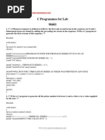 check++; // INCREMENT CHECK IF NO. IS NOT A PRIME NO. break; } if(check == 0) printf("%d\t",counter); } getch(); } 3) Write a C program to find the sum of individual digits of a positive integer. program: #include<stdio.h> #include<conio.h> void main() { int num, k=1, sum=0; clrscr(); printf("Enter the number whose digits are to be added:"); scanf("%d",&num); while(num!=0) { k=num%10; sum=sum+k; k=num/10; num=k; } printf("Sum of the digits:%d",sum); getch(); } week 2: 1) Write a C program to calculate the following Sum: Sum=1-x2/2! +x4/4!-x6/6!+x8/8!-x10/10! program: #include <stdio.h> #include <math.h> void main() { int counter,f_coun; float sum=0,x,power,fact; clrscr(); printf("<-----------------------PROGRAM FOR SUM OF EQ. SERIES---------------------->"); printf("\n\n\tEQUATION SERIES : 1- X^2/2! + X^4/4! - X^6/6! + X^8/8! - X^10/10!" ); printf("\n\n\n\tENTER VALUE OF X : "); scanf("%f",&x); for(counter=0, power=0; power<=10; counter++,power=power+2) { fact=1;