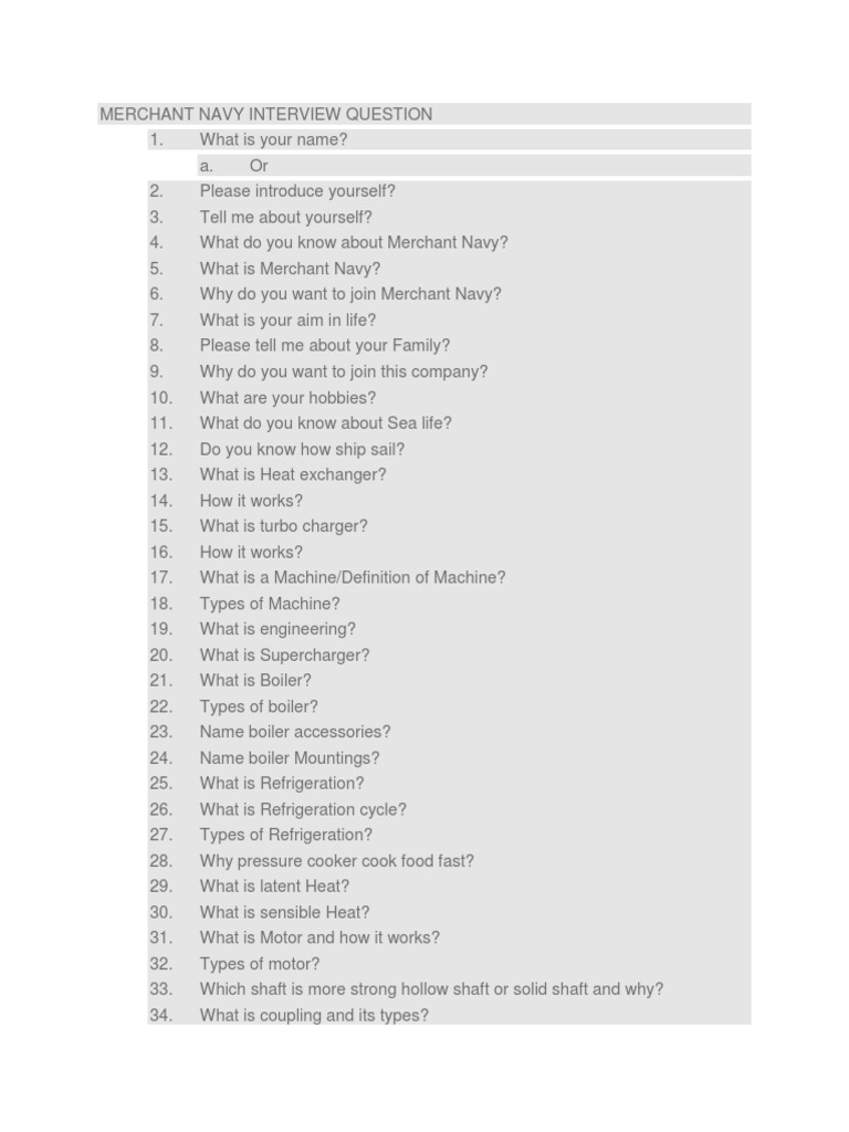 What do you know about Merchant Navy? 5. What is Merchant Navy? 6. Why do you want to join Merchant Navy? 7. What is your aim in life? 8. Please tell me about your Family? 9. 10. 11. 12. 13. 14. 15. 16. 17. 18. 19. 20. 21. 22. 23. 24. 25. 26. 27. 28. 29. 30. 31. 32. 33. 34. Why do you want to join this company? What are your hobbies? What do you know about Sea life? Do you know how ship sail? What is Heat exchanger? How it works? What is turbo charger? How it works? What is a Machine/Definition of Machine? Types of Machine? What is engineering? What is Supercharger? What is Boiler? Types of boiler? Name boiler accessories? Name boiler Mountings? What is Refrigeration? What is Refrigeration cycle? Types of Refrigeration? Why pressure cooker cook food fast? What is latent Heat? What is sensible Heat? What is Motor and how it works? Types of motor? Which shaft is more strong hollow shaft or solid shaft and why? What is coupling and its types?