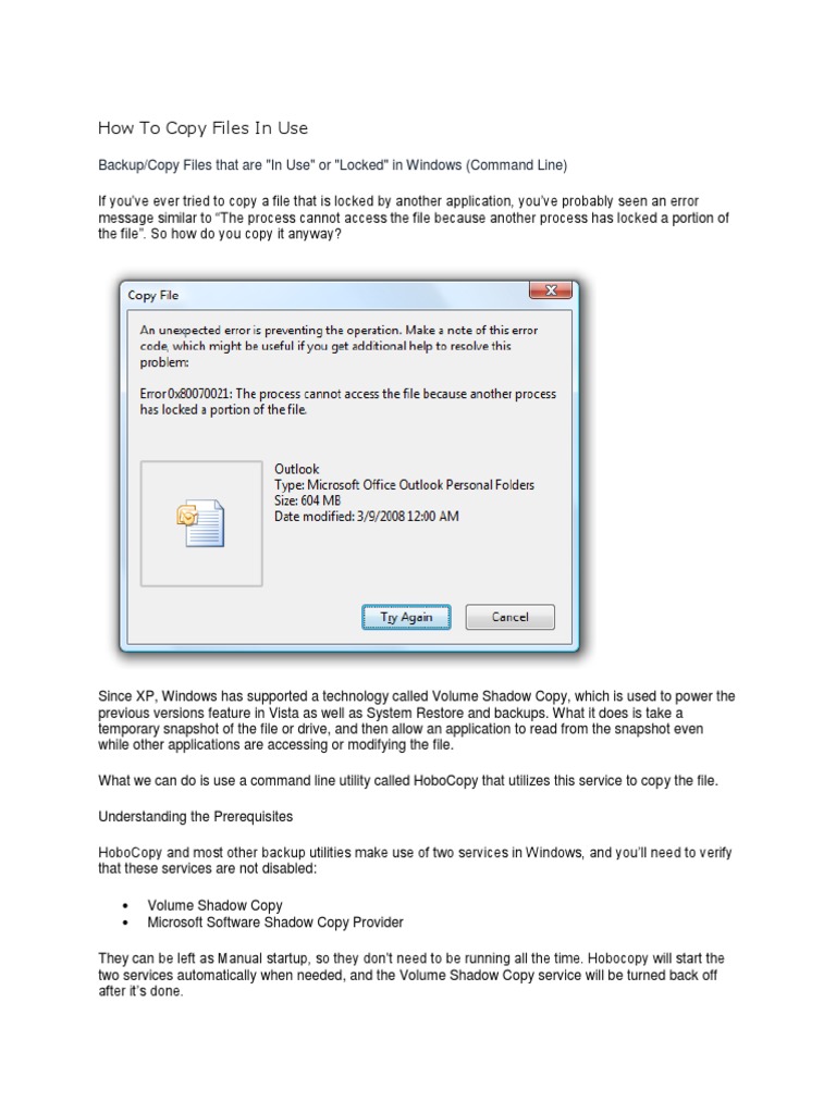 Since XP, Windows has supported a technology called Volume Shadow Copy, which is used to power the previous versions feature in Vista as well as System Restore and backups. What it does is take a temporary snapshot of the file or drive, and then allow an application to read from the snapshot even while other applications are accessing or modifying the file. What we can do is use a command line utility called HoboCopy that utilizes this service to copy the file. Understanding the Prerequisites HoboCopy and most other backup utilities make use of two services in Windows, and youll need to verify that these services are not disabled: Volume Shadow Copy Microsoft Software Shadow Copy Provider