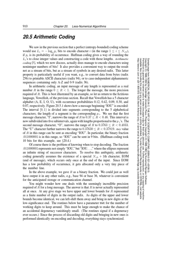 We saw in the previous section that a perfect (entropy-bounded) coding scheme would use Li = log2 pi bits to encode character i (in the range 1 i N ch ), if pi is its probability of occurrence. Huffman coding gives a way of rounding the Li s to close integer values and constructing a code with those lengths. Arithmetic coding [1], which we now discuss, actually does manage to encode characters using noninteger numbers of bits! It also provides a convenient way to output the result not as a stream of bits, but as a stream of symbols in any desired radix. This latter property is particularly useful if you want, e.g., to convert data from bytes (radix 256) to printable ASCII characters (radix 94), or to case-independent alphanumeric sequences containing only A-Z and 0-9 (radix 36). In arithmetic coding, an input message of any length is represented as a real number R in the range 0 R < 1. The longer the message, the more precision required of R. This is best illustrated by an example, so let us return to the ctitious language, Vowellish, of the previous section. Recall that Vowellish has a 5 character alphabet (A, E, I, O, U), with occurrence probabilities 0.12, 0.42, 0.09, 0.30, and 0.07, respectively. Figure 20.5.1 shows how a message beginning IOU is encoded: The interval [0, 1) is divided into segments corresponding to the 5 alphabetical characters; the length of a segment is the corresponding p i . We see that the rst message character, I, narrows the range of R to 0.37 R < 0.46. This interval is now subdivided into ve subintervals, again with lengths proportional to the p i s. The second message character, O, narrows the range of R to 0.3763 R < 0.4033. The U character further narrows the range to 0.37630 R < 0.37819. Any value of R in this range can be sent as encoding IOU. In particular, the binary fraction .011000001 is in this range, so IOU can be sent in 9 bits. (Huffman coding took 10 bits for this example, see 20.4.) Of course there is the problem of knowing when to stop decoding. The fraction .011000001 represents not simply IOU, but IOU. . . , where the ellipses represent an innite string of successor characters. To resolve this ambiguity, arithmetic coding generally assumes the existence of a special N ch + 1th character, EOM (end of message), which occurs only once at the end of the input. Since EOM has a low probability of occurrence, it gets allocated only a very tiny piece of the number line. In the above example, we gave R as a binary fraction. We could just as well have output it in any other radix, e.g., base 94 or base 36, whatever is convenient for the anticipated storage or communication channel. You might wonder how one deals with the seemingly incredible precision required of R for a long message. The answer is that R is never actually represented all at once. At any give stage we have upper and lower bounds for R represented as a nite number of digits in the output radix. As digits of the upper and lower bounds become identical, we can left-shift them away and bring in new digits at the low-signicance end. The routines below have a parameter NWK for the number of working digits to keep around. This must be large enough to make the chance of an accidental degeneracy vanishingly small. (The routines signal if a degeneracy ever occurs.) Since the process of discarding old digits and bringing in new ones is performed identically on encoding and decoding, everything stays synchronized.