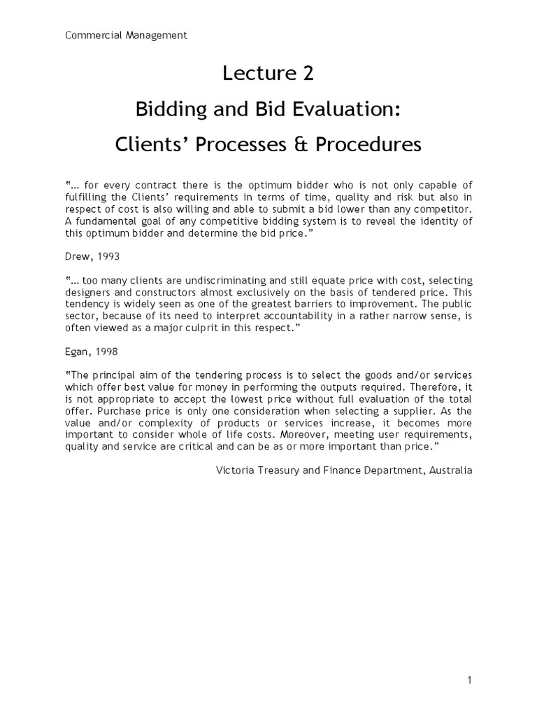 Bidding and Bid Evaluation: Clients Processes & Procedures 1998). Egans findings, however, have implications for procurement general and are not restricted solely to the construction industry.