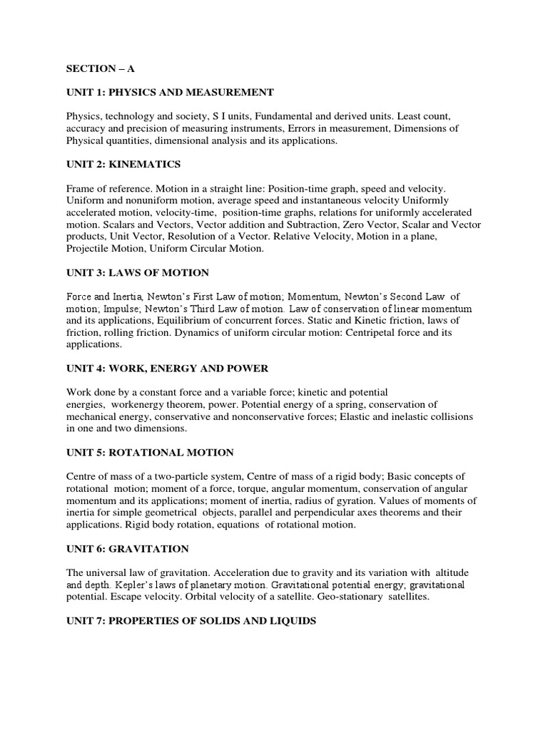 . Least count, accuracy and precision of measuring instruments, Errors in measurement, Dimensions of Physical quantities, dimensional analysis and its applications. UNIT 2: KINEMATICS Frame of reference. Motion in a straight line: Position-time graph, speed and velocity. Uniform and nonuniform motion, average speed and instantaneous velocity Uniformly accelerated motion, velocity-time, position-time graphs, relations for uniformly accelerated motion. Scalars and Vectors, Vector addition and Subtraction, Zero Vector, Scalar and Vector products, Unit Vector, Resolution of a Vector. Relative Velocity, Motion in a plane, Projectile Motion, Uniform Circular Motion. UNIT 3: LAWS OF MOTION Force and Inertia, Newtons First Law of motion; Momentum, Newtons Second Law of motion; Impulse; Newtons Third Law of motion. Law of conservation of linear momentum and its applications, Equilibrium of concurrent forces. Static and Kinetic friction, laws of friction, rolling friction. Dynamics of uniform circular motion: Centripetal force and its applications. UNIT 4: WORK, ENERGY AND POWER Work done by a constant force and a variable force; kinetic and potential energies, workenergy theorem, power. Potential energy of a spring, conservation of mechanical energy, conservative and nonconservative forces; Elastic and inelastic collisions in one and two dimensions. UNIT 5: ROTATIONAL MOTION Centre of mass of a two-particle system, Centre of mass of a rigid body; Basic concepts of rotational motion; moment of a force, torque, angular momentum, conservation of angular momentum and its applications; moment of inertia, radius of gyration. Values of moments of inertia for simple geometrical objects, parallel and perpendicular axes theorems and their applications. Rigid body rotation, equations of rotational motion. UNIT 6: GRAVITATION The universal law of gravitation. Acceleration due to gravity and its variation with altitude and depth. Keplers laws of planetary motion. Gravitational potential energy; gravitational potential. Escape velocity. Orbital velocity of a satellite. Geo-stationary satellites. UNIT 7: PROPERTIES OF SOLIDS AND LIQUIDS
