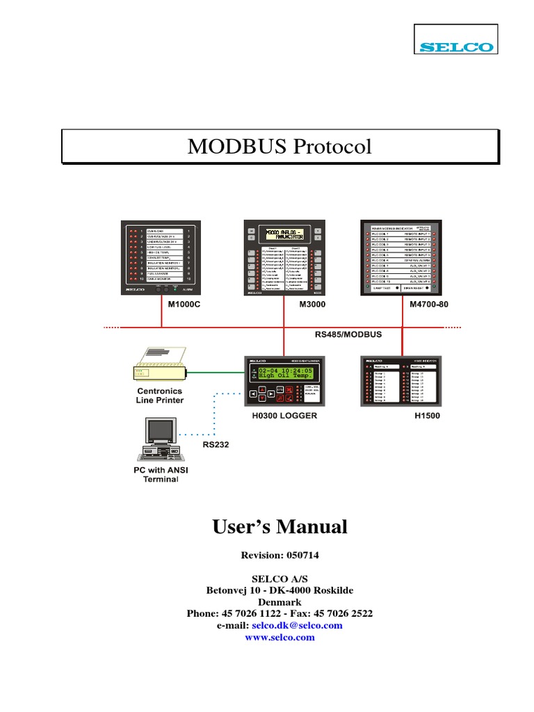 This document describes the features and functions of the RS485 based serial communication interface of the SELCO M1000C Alarm Annunciator (new edition), the SELCO M2000C Engine Controller (new edition), the SELCO M3000 Analog Alarm Annunciator (new edition), the SELCO M4700-80 Indicator Panel, the SELCO H1500 Indicator Panel and the SELCO H3000 Analog Alarm Annunciator. The serial communication interface is RS485 and the communication protocol is MODBUS RTU.
