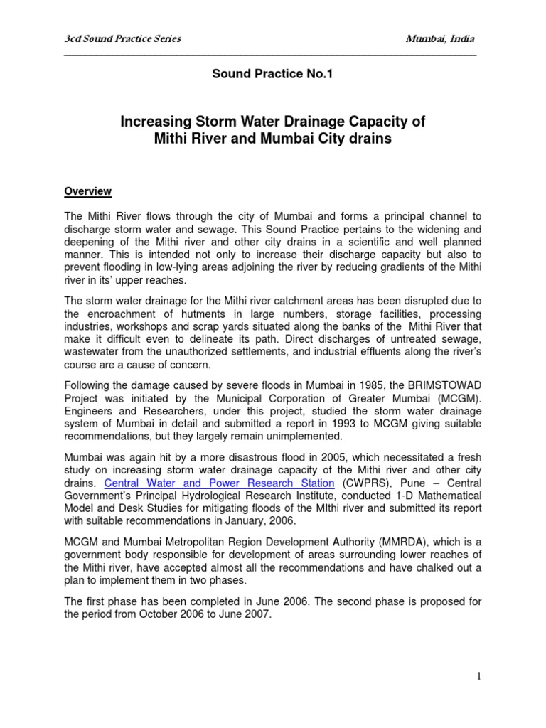 Overview The Mithi River flows through the city of Mumbai and forms a principal channel to discharge storm water and sewage. This Sound Practice pertains to the widening and deepening of the Mithi river and other city drains in a scientific and well planned manner. This is intended not only to increase their discharge capacity but also to prevent flooding in low-lying areas adjoining the river by reducing gradients of the Mithi river in its upper reaches. The storm water drainage for the Mithi river catchment areas has been disrupted due to the encroachment of hutments in large numbers, storage facilities, processing industries, workshops and scrap yards situated along the banks of the Mithi River that make it difficult even to delineate its path. Direct discharges of untreated sewage, wastewater from the unauthorized settlements, and industrial effluents along the rivers course are a cause of concern. Following the damage caused by severe floods in Mumbai in 1985, the BRIMSTOWAD Project was initiated by the Municipal Corporation of Greater Mumbai (MCGM). Engineers and Researchers, under this project, studied the storm water drainage system of Mumbai in detail and submitted a report in 1993 to MCGM giving suitable recommendations, but they largely remain unimplemented. Mumbai was again hit by a more disastrous flood in 2005, which necessitated a fresh study on increasing storm water drainage capacity of the Mithi river and other city drains. Central Water and Power Research Station (CWPRS), Pune Central Governments Principal Hydrological Research Institute, conducted 1-D Mathematical Model and Desk Studies for mitigating floods of the MIthi river and submitted its report with suitable recommendations in January, 2006. MCGM and Mumbai Metropolitan Region Development Authority (MMRDA), which is a government body responsible for development of areas surrounding lower reaches of the Mithi river, have accepted almost all the recommendations and have chalked out a plan to implement them in two phases. The first phase has been completed in June 2006. The second phase is proposed for the period from October 2006 to June 2007.