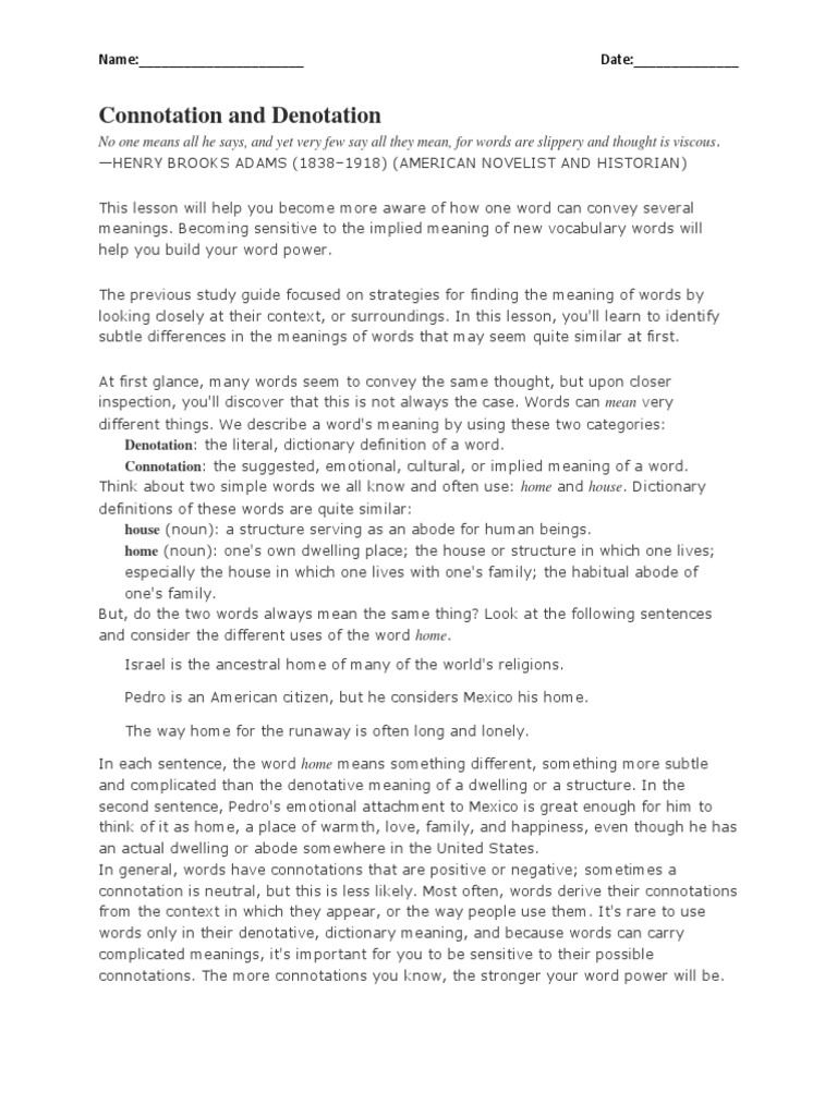 No one means all he says, and yet very few say all they mean, for words are slippery and thought is viscous. HENRY BROOKS ADAMS (18381918) (AMERICAN NOVELIST AND HISTORIAN) This lesson will help you become more aware of how one word can convey several meanings. Becoming sensitive to the implied meaning of new vocabulary words will help you build your word power. The previous study guide focused on strategies for finding the meaning of words by looking closely at their context, or surroundings. In this lesson, you'll learn to identify subtle differences in the meanings of words that may seem quite similar at first. At first glance, many words seem to convey the same thought, but upon closer inspection, you'll discover that this is not always the case. Words can mean very different things. We describe a word's meaning by using these two categories: Denotation: the literal, dictionary definition of a word. Connotation: the suggested, emotional, cultural, or implied meaning of a word. Think about two simple words we all know and often use: home and house. Dictionary definitions of these words are quite similar: house (noun): a structure serving as an abode for human beings. home (noun): one's own dwelling place; the house or structure in which one lives; especially the house in which one lives with one's family; the habitual abode of one's family. But, do the two words always mean the same thing? Look at the following sentences and consider the different uses of the word home. Israel is the ancestral home of many of the world's religions. Pedro is an American citizen, but he considers Mexico his home. The way home for the runaway is often long and lonely. In each sentence, the word home means something different, something more subtle and complicated than the denotative meaning of a dwelling or a structure. In the second sentence, Pedro's emotional attachment to Mexico is great enough for him to think of it as home, a place of warmth, love, family, and happiness, even though he has an actual dwelling or abode somewhere in the United States. In general, words have connotations that are positive or negative; sometimes a connotation is neutral, but this is less likely. Most often, words derive their connotations from the context in which they appear, or the way people use them. It's rare to use words only in their denotative, dictionary meaning, and because words can carry complicated meanings, it's important for you to be sensitive to their possible connotations. The more connotations you know, the stronger your word power will be.