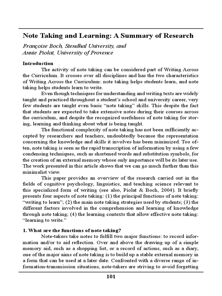 Introduction The activity of note taking can be considered part of Writing Across the Curriculum. It crosses over all disciplines and has the two characteristics of Writing Across the Curriculum: note taking helps students learn, and note taking helps students learn to write. Even though techniques for understanding and writing texts are widely taught and practiced throughout a students school and university career, very few students are taught even basic note taking skills. This despite the fact that students are expected to take extensive notes during their courses across the curriculum, and despite the recognized usefulness of note taking for storing, learning and thinking about what is being taught. The functional complexity of note taking has not been sufciently accepted by researchers and teachers, undoubtedly because the representation concerning the knowledge and skills it involves has been minimized. Too often, note taking is seen as the rapid transcription of information by using a few condensing techniques, such as shortened words and substitution symbols, for the creation of an external memory whose only importance will be its later use. The work presented in this article shows that we can go much further than this minimalist view. This paper provides an overview of the research carried out in the elds of cognitive psychology, linguistics, and teaching science relevant to this specialized form of writing (see also, Piolat & Boch, 2004). It briey presents four aspects of note taking: (1) the principal functions of note taking: writing to learn; (2) the main note taking strategies used by students; (3) the different factors involved in the comprehension and learning of knowledge through note taking; (4) the learning contexts that allow effective note taking: learning to write. 1. What are the functions of note taking? Note-takers take notes to fulll two major functions: to record information and/or to aid reection. Over and above the drawing up of a simple memory aid, such as a shopping list, or a record of actions, such as a diary, one of the major aims of note taking is to build up a stable external memory in a form that can be used at a later date. Confronted with a diverse range of information-transmission situations, note-takers are striving to avoid forgetting