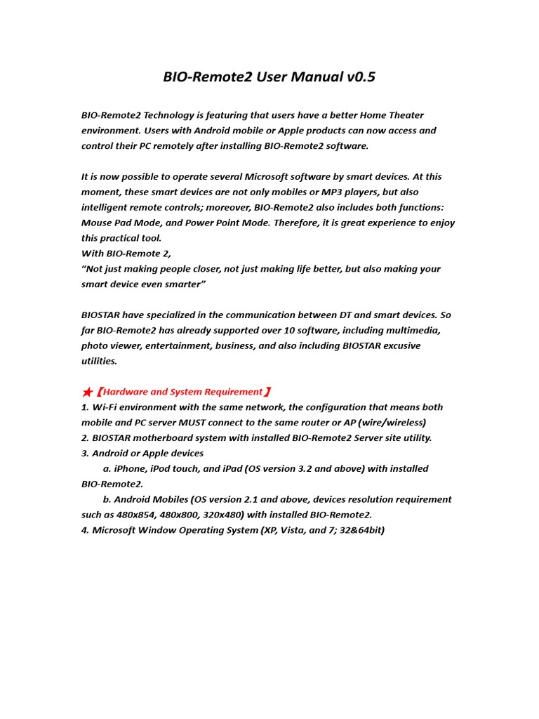 BIORemote2TechnologyisfeaturingthatusershaveabetterHomeTheater environment.UserswithAndroidmobileorAppleproductscannowaccessand controltheirPCremotelyafterinstallingBIORemote2software. ItisnowpossibletooperateseveralMicrosoftsoftwarebysmartdevices.Atthis moment,thesesmartdevicesarenotonlymobilesorMP3players,butalso intelligentremotecontrols;moreover,BIORemote2alsoincludesbothfunctions: MousePadMode,andPowerPointMode.Therefore,itisgreatexperiencetoenjoy thispracticaltool. WithBIORemote2, Notjustmakingpeoplecloser,notjustmakinglifebetter,butalsomakingyour smartdeviceevensmarter BIOSTARhavespecializedinthecommunicationbetweenDTandsmartdevices.So farBIORemote2hasalreadysupportedover10software,includingmultimedia, photoviewer,entertainment,business,andalsoincludingBIOSTARexcusive utilities. HardwareandSystemRequirement 1.WiFienvironmentwiththesamenetwork,theconfigurationthatmeansboth mobileandPCserverMUSTconnecttothesamerouterorAP(wire/wireless) 2.BIOSTARmotherboardsystemwithinstalledBIORemote2Serversiteutility. 3.AndroidorAppledevices a.iPhone,iPodtouch,andiPad(OSversion3.2andabove)withinstalled BIORemote2. b.AndroidMobiles(OSversion2.1andabove,devicesresolutionrequirement suchas480x854,480x800,320x480)withinstalledBIORemote2. 4.MicrosoftWindowOperatingSystem(XP,Vista,and7;32&64bit)