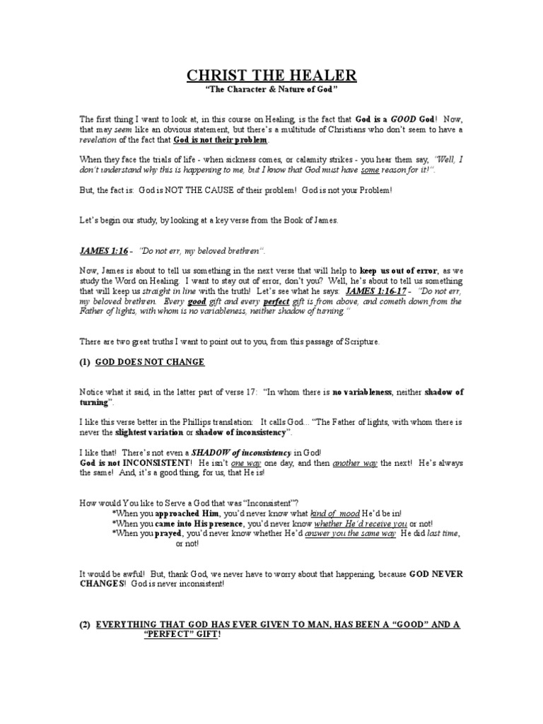 The Character & Nature of God The first thing I want to look at, in this course on Healing, is the fact that God is a GOOD God! Now, that may seem like an obvious statement, but theres a multitude of Christians who dont seem to have a revelation of the fact that God is not their proble . hen they face the trials of life ! when sickness comes, or calamity strikes ! you hear them say, Well, I dont understand why this is happening to me, but I know that God must have some reason for it!. "ut, the fact is# $od is N%T TH& C'()& of their *roblem! $od is not your +roblem! ,ets begin our study, by looking at a key verse from the "ook of -ames. JAMES 1:16 - o not err, my beloved brethren. Now, -ames is about to tell us something in the ne.t verse that will hel* to !eep us out of error, as we study the ord on Healing. I want to stay out of error, dont you/ ell, hes about to tell us something that will kee* us straight in line with the truth! ,ets see what he says# JAMES 1:16-17 - o not err, my beloved brethren. !very good gift and every perfect gift is from above, and "ometh down from the #ather of lights, with whom is no variableness, neither shadow of turning. There are two great truths I want to *oint out to you, from this *assage of )cri*ture. "#$ G%& &%ES N%T CHANGE Notice what it said, in the latter *art of verse 01# 2In whom there is no 'ariableness, neither shado( of turnin)3. I like this verse better in the +hilli*s translation# It calls $od... 2The 4ather of lights, with whom there is never the sli)htest 'ariation or shado( of inconsistenc* 3. I like that! Theres not even a SHADOW of inconsistency in $od! God is not INC%NSISTENT! He isnt one way one day, and then another way the ne.t! Hes always the same! 'nd, its a good thing, for us, that He is! How would 5ou like to )erve a $od that was 2Inconsistent3/ 6 hen you approached Hi , youd never know what kind of mood Hed be in! 6 hen you ca e into His presence , youd never know whether $ed re"eive you or not! 6 hen you pra*ed, youd never know whether Hed answer you the same way He did last time , or not! It would be awful! "ut, thank $od, we never have to worry about that ha**ening, because G%& NE+ER CHANGES! $od is never inconsistent!