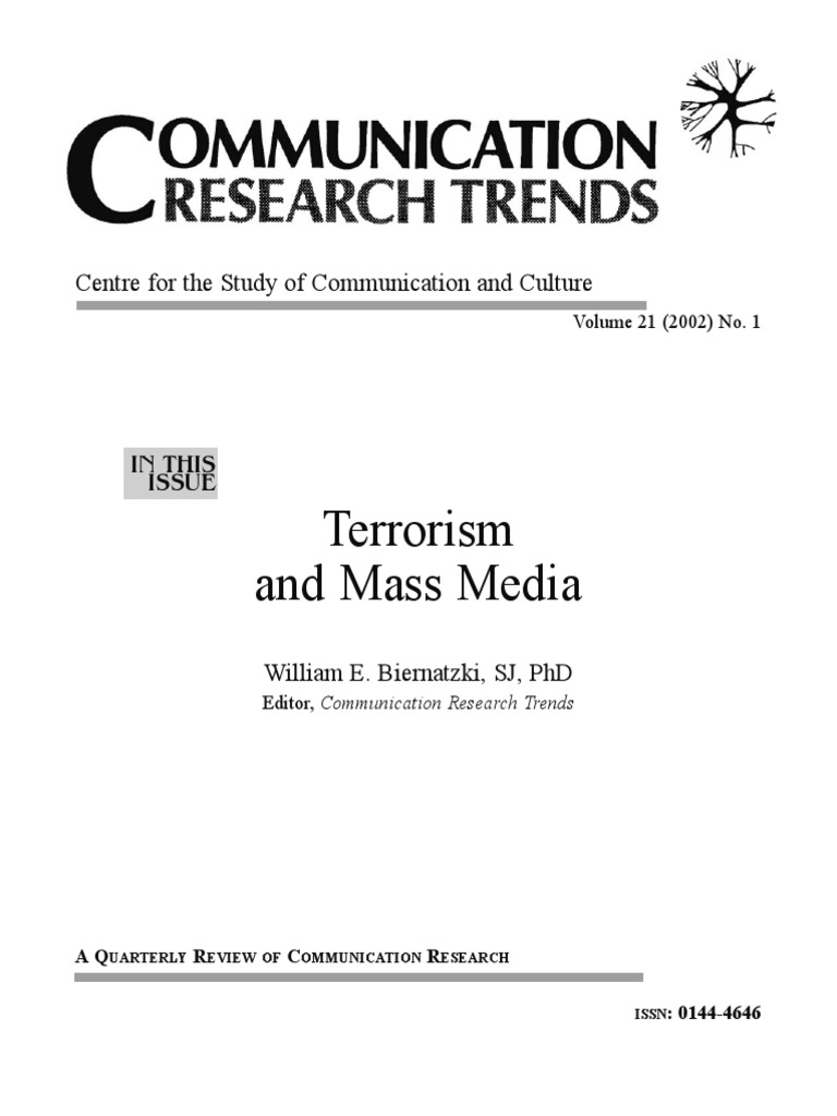 Stohl, M. 1983. Myths and Realities of Political Terrorism. In The Politics of Terrorism, edited by M. Stohl. New York: Marcel Dekker, pp. 1-22. Talbott, Strobe, and Nayan Chanda (eds.). 2002. The Age of Terror: America and the World After September 11. Basic Books/Yale Center for the Study of Globalization, 2002. TBS. 2002. TBS Special Report CNN/Al-Jazeera. TBS Studies, online at www.tbsjournal.com Adam Center for Television Journalism, American University in Cairo. Received by Communication Research Trends from TBS@aucegypt.edu on 28 February 2002. Terrorism Research Center. 2002. http://www.terrorism.com /index.shtml [1996-2000] Wardlaw, Grant. 1982. Political Terrorism. London: Cambridge University Press. Wardlaw, Grant. 1989. Political Terrorism: Theory, Tactics, and Counter-measures (2nd edition). New York: Cambridge University Press. Wendland, Mike. 2001. Sites Track Post-9/11 Censorship Incidents. Poynter.org http://www.poynter.org/ web/111601mike.htm November 16, 2001. Wieviorka, Michel. 1988. The Making of Terrorism. Chicago: University of Chicago Press. Wilkinson, Paul. 1974. Political Terrorism. London: Macmillan. Wilkinson, Paul. 1981. Can the State Be Terrorist? International Affairs. Vol. 57, No. 3k, pp. 467-472. Wilkinson, Paul. 1997. The Media and Terrorism: A Reassessment. Terrorism and Political Violence. Vol. 9, No. 2 (Summer), pp. 51-64