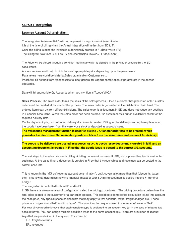 It is at the time of billing when the Actual integration will reflect from SD to FI. Once the billing is done the Invoice is automatically created in FI.(Doc.type is RV) The billing will flow from SD-FI as RV document(Sales Invoice= DR document). The Price will be picked through a condition technique which is defined in the pricing procedure by the SD consultants. Access sequence will help to pick the most appropriate price depending upon the parameters. Parameters here could be Material,Sales organisation,Customer etc... Prices will be defined from Most specific to most general for various combination of parameters in the access sequence. Data will hit appropriate GL Accounts which you mention in T.code:VKOA Sales Process: The sales order forms the basis of the sales process. Once a customer has placed an order, a sales order must be created at the start of the process. The sales order is generated at the distribution chain level. The ordered items can be from different divisions. The sales order is a document in SD and does not cause any postings in Financial Accounting. When the sales order has been entered, the system carries out an availability check for the required delivery date. On the day of shipping, an outbound delivery document is created. Billing for the delivery can only take place when the goods have been taken from the warehouse stock and posted as a goods issue. The warehouse management function is used for picking . A transfer order has to be created, which generates the pick order. The requested goods are taken from the warehouse and prepared for delivery. The goods to be delivered are posted as a goods issue . A goods issue document is created in MM, and an accounting document is created in FI so that the goods issue is posted to the correct G/L accounts. The last stage in the sales process is billing. A billing document is created in SD, and a printed invoice is sent to the customer. At the same time, a document is created in FI so that the receivables and revenues can be posted to the correct accounts. This is known in the IMG as "revenue account determination", but it covers a lot more than that (discounts, taxes etc). This is what determines how the financial impact of your SD Billing document is posted into the FI General Ledger. The integration is controlled both in SD and in FI. In SD there is a awesome area of configuration called the pricing procedures. The pricing procedure determines the final price quoted to the customer for a particular product. This could be a complicated calculation taking into account the base price, any special prices or discounts that may apply to that scenario, taxes, freight charges etc. These prices or charges are called 'condition types'. This condition technique is used in a number of areas of SAP. For now all we need to know is that each condition type is assigned to an account key (or in the case of rebates two account keys). You can assign multiple condition types to the same account key. There are a number of account keys that are pre-defined in the system. For example: ERF freight revenues ERL revenues